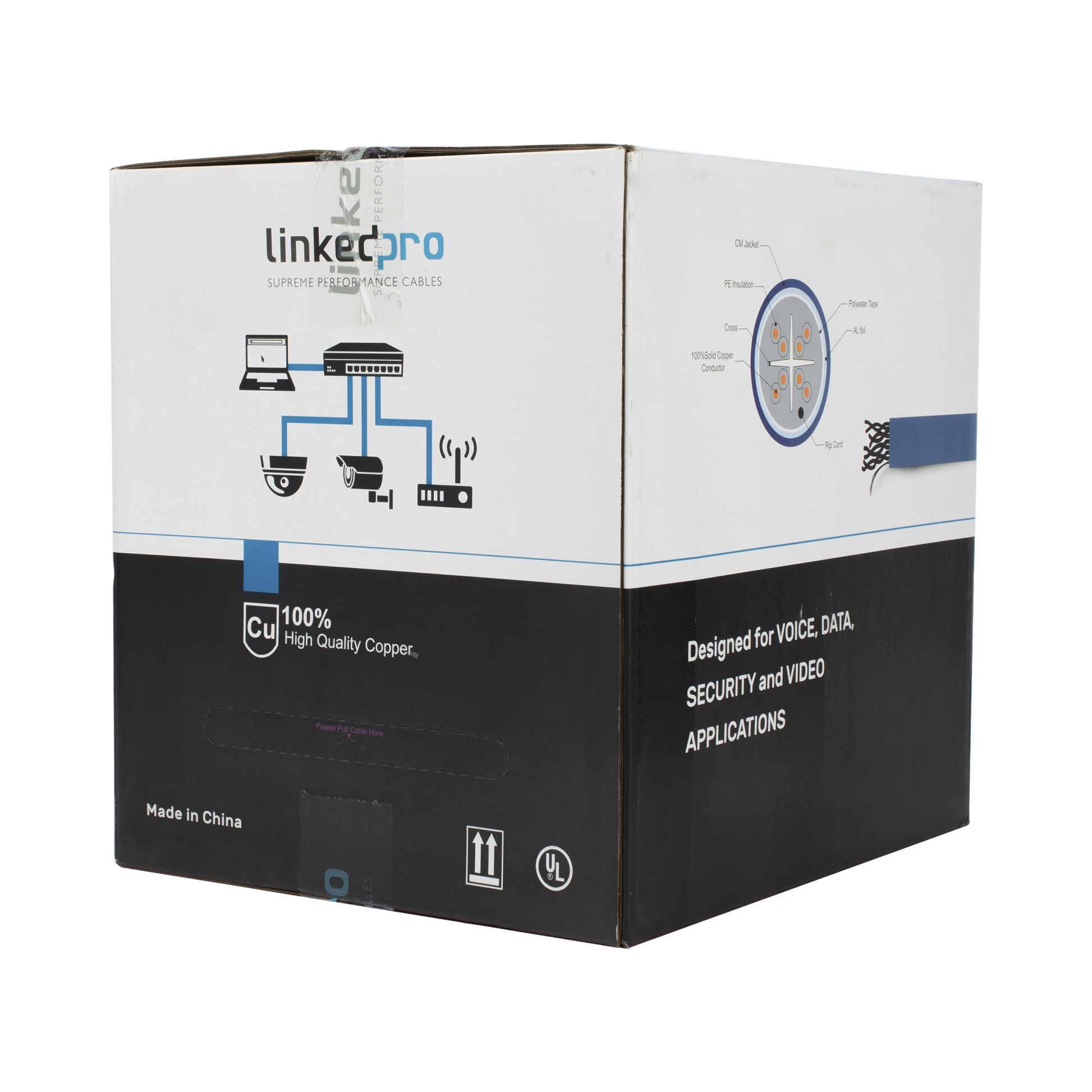 Bobina de cable de 305 metros Cat6+ Blindado F/UTP, CM, CALIBRE 23 ALTO RENDIMIENTO, ETL,UL, color azul, super flexible, para aplicaciones de video vigilancia, video HD, y redes de datos. Uso interior.